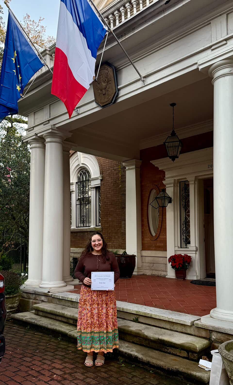 The celebration continued at the Residence de France, where Molly and Erin were honored in a special ceremony led by Mr. Rodolphe Sambou, Consul General of France. Each student received a certificate of recognition and a monetary award—an unforgettable experience that highlights the significance of their hard work and talent.