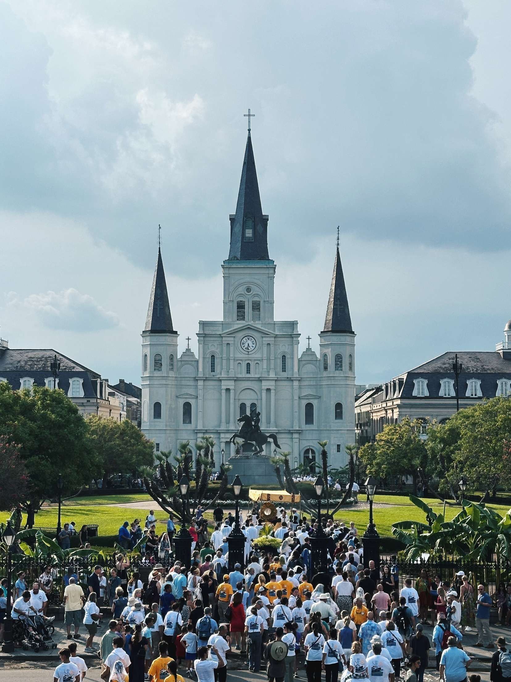 The Archdiocese of Baton Rouge & New Orleans wanted to have an Eucharistic Procession in a Louisiana fashion. The procession started in Baton Rouge, made its way down the Mississippi River on steam boats, and concluded in New Orleans at the St. Louis Cathedral in Jackson Square. When the procession arrived at the ports, they used cranes to remove the 14 foot monstrance, that held the Eucharist, from the boat. Once the Eucharist was taken out, everyone processed to the Cathedral, where the celebration of Mass was to be held.