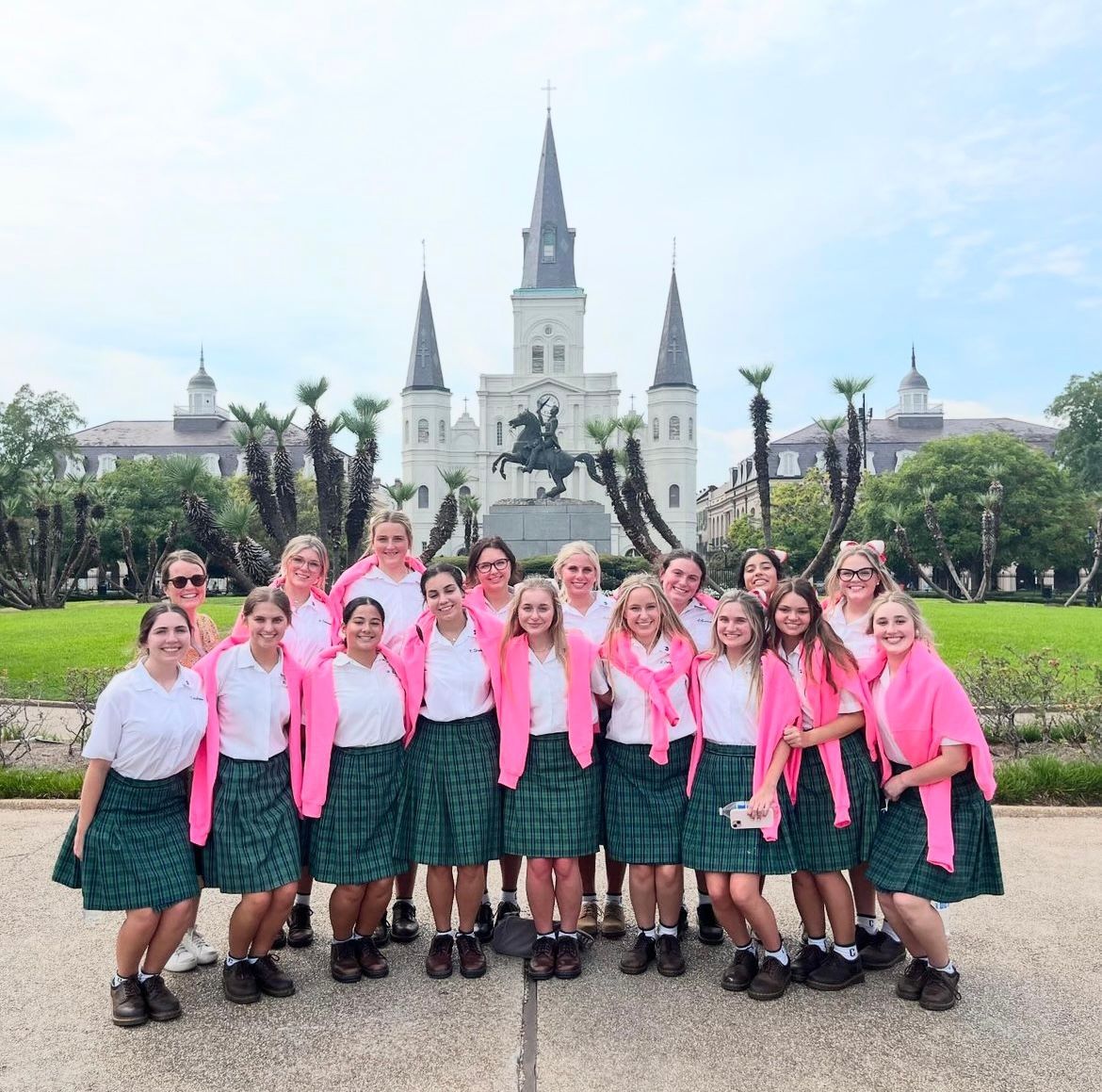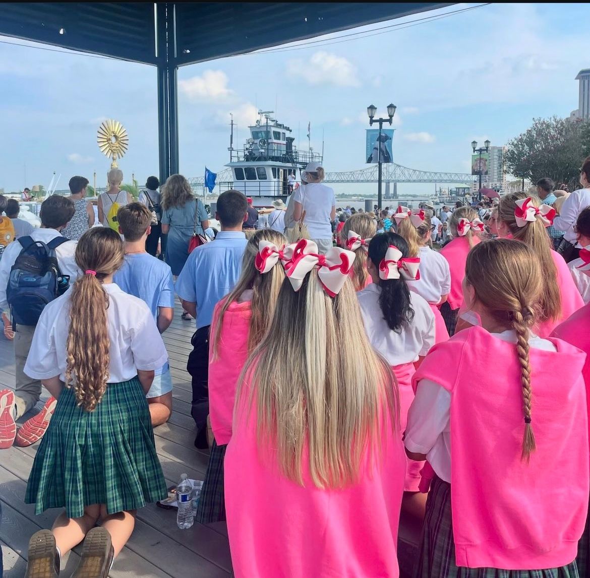 The Cathedral had reached maximum capacity before Mass even began. Even though the Cathedral reached maximum capacity there was still a long line of people standing outside to hear the Mass. This experience gave the students a deeper understanding of Jesus’ true presence. Chapelle’s Campus Minister Ms. Emily Lannan said “it was really powerful to see people just stopping and kneeling in the middle of the French Quarter when they saw the Blessed Sacrament approach. I was really impressed with the Chapelle and Rummel students in particular because even in the midst of the heat, crowds, and kneeling on concrete, they were really praying.” Ms. Lannan said she was inspired by the students. One of Ms. Lannan’s favorite moment was when the first boats arrived that preceded the monstrance. One of the boats had a giant bell that was being rung and another boat had burning incense that you could smell from the street. Both of these boats were announcing that the Lord was approaching! Senior Katie Scuderi said this experience deepened her faith by “I’ve never experienced a display of Jesus’s majesty and the beauty of His love in this way before. They way everyone lined up along the Mississippi and knelt on the ground singing songs of praise to Jesus in the Eucharist, you could tell that Jesus was truly present.” Katie also said that “the entire crowd was singing and adoring Jesus and it made her think about how much joy it must give the heart of Jesus to hear the voices of His children reaching out to Him. As I scanned the crowd, all I saw was pure awe and wonder in everyone’s gaze as they looked at Jesus.” Katie also said that “her classmates and her heard about this trip days before it was supposed to take place and the immediate willingness and enthusiasm of all my friends was astounding to me. The fact that this group of Chapelle and Rummel students showed up to a Eucharistic procession unprompted goes to show the powerful ways God can work with our “yes” to Him. Katie believes that if she did not go on this field trip she would have missed all the beautiful ways she encountered Jesus and witnessing the joy of the moment her friends saw Jesus. Katie said she will take every opportunity given to her to say “yes” to all the campus ministry opportunities I can and encourage others to attend with her. She believes “I’ll never regret giving my time to those things, because as I remember Ms. Lannan once said, “time spent with the Lord is never wasted.”