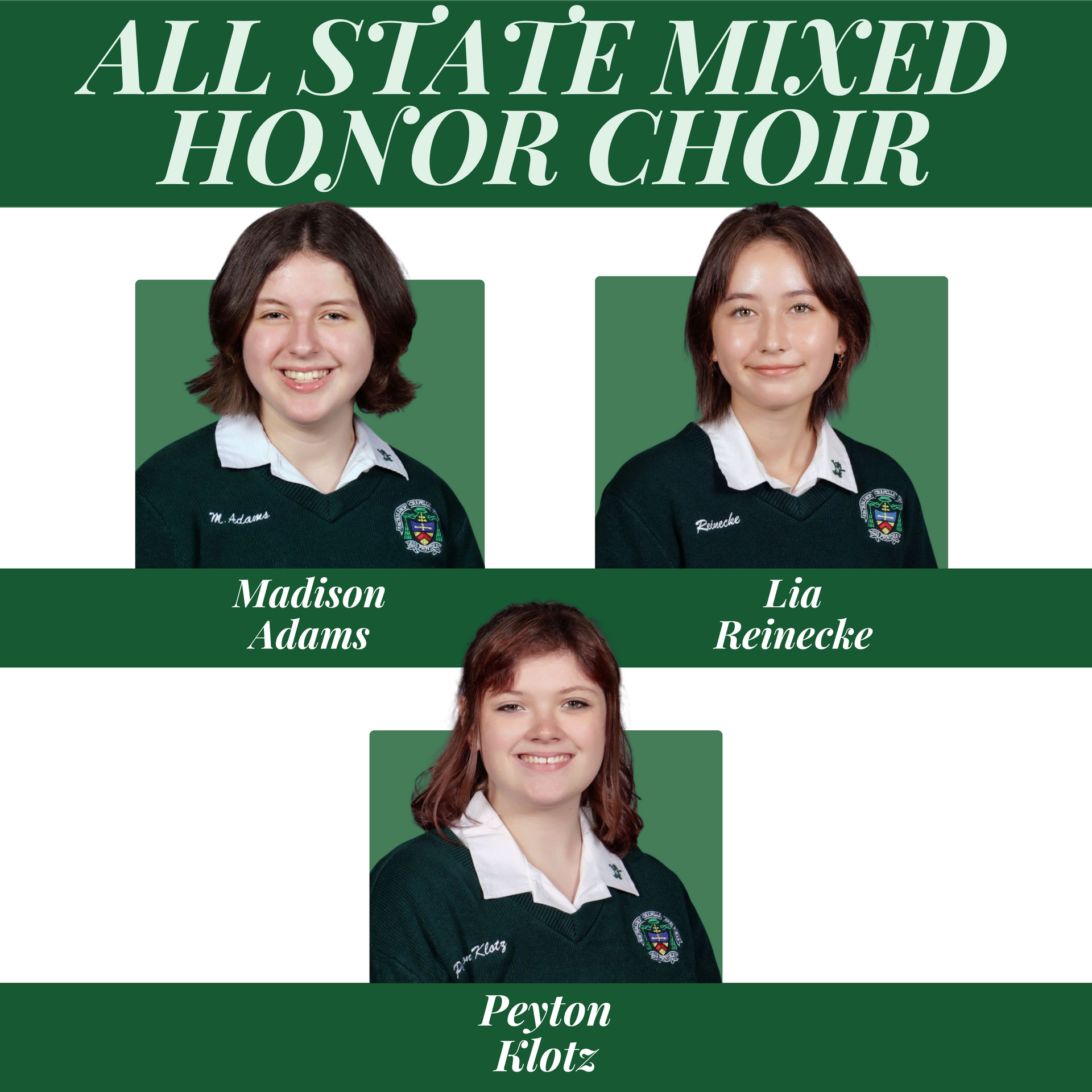 👏Madison Adams, Lia Reinecke, and Peyton Klotz for making it into the All-State Mixed Honor Choir!