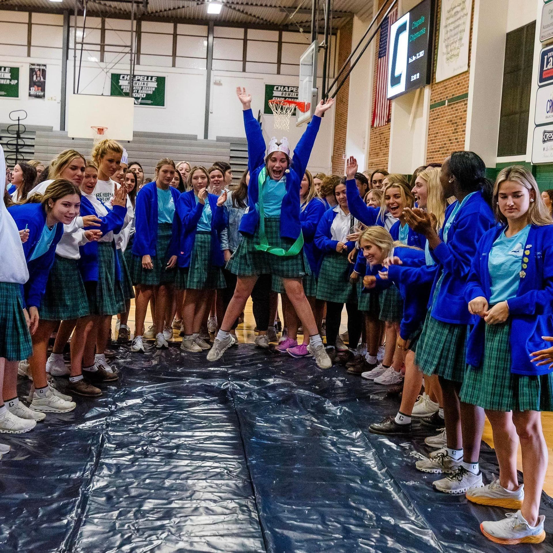 Turkey Bowl brought together our amazing student body for a fun-filled Thanksgiving competition. There's nothing quite like the joy of spending time with our sisters, rolling frozen turkeys down the Gym floor, all in the spirited pursuit of those precious Spirit Points! Students from each grade took turns "bowling" frozen turkeys own the black tarp lane to knock down 2 liters and win for their grade level.  The jumps for joy say it all...Turkey Bowl was a smashing hit!